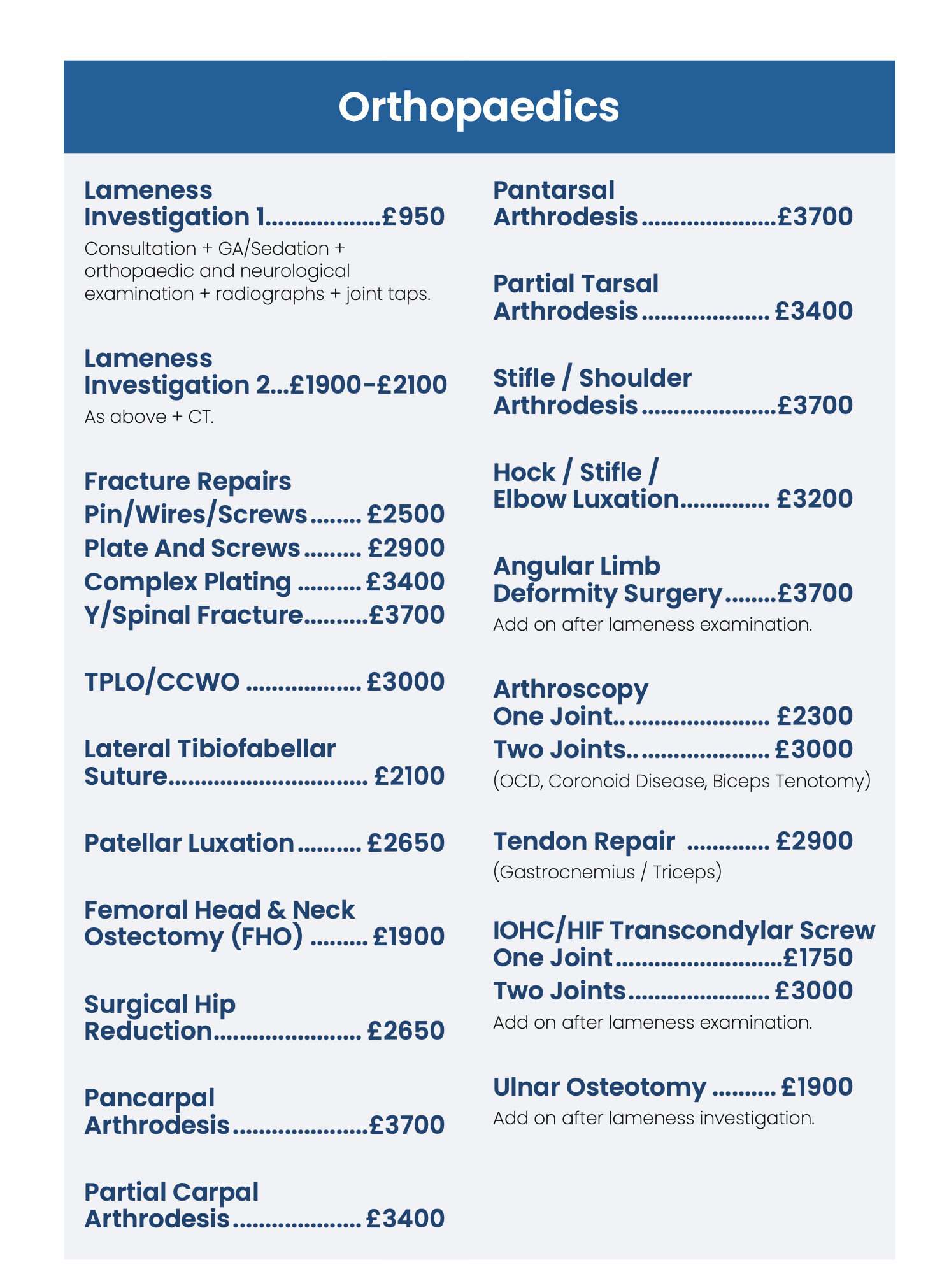 You will have been given an estimate of costs upon us arranging your pet’s referral. A full price list is also available below. WE ARE PLEASED TO CONFIRM OUR PRICES REMAIN THE SAME FOR 2025.