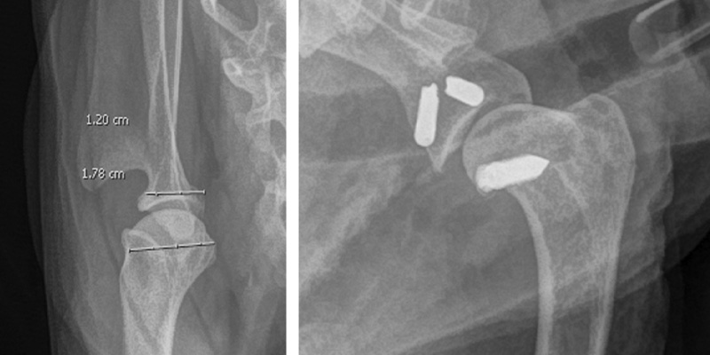 Within this, it was observed there was no significant damage to the cartilage. The surgeon placed implants which anchored the proximal humerus to the medial distal scapula. After strict rest with gentle PROM physiotherapy and hydrotherapy started 3 weeks-post operatively, Martha’s 6-week review highlighted that the lameness was much improved, she was fully weightbearing and walking well 50% more than she had been prior to referral, without the need for analgesia. Martha will return for orthopaedic examination with repeat radiographs if warranted, but in the meantime her owner reports she is doing very well and managing up to 20-minute walks without issue.
