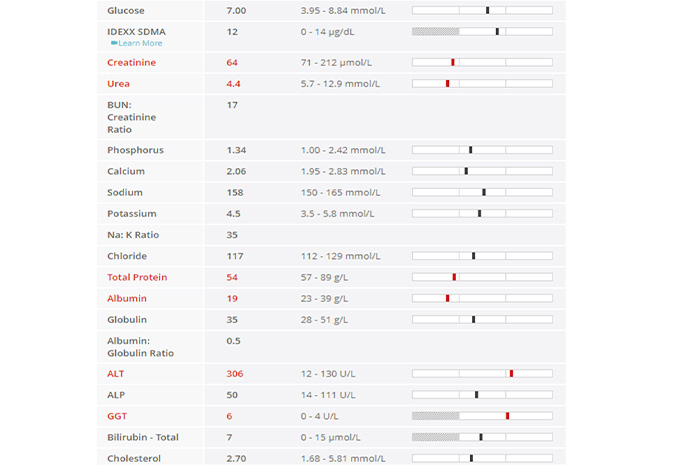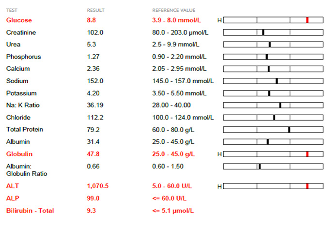 Sooty recovered well, with opioid analgesia (methadone), anti-emetic (maropitant) and antibiotics (amoxicillin and clavulanic acid) on board as well as intravenous fluid therapy (IVFT). 24 hours after surgery she had eaten a small amount, and her pain score was low: 2/16. The vet recommended increasing the time interval between analgesia doses. Within the next 24 hours, Sooty seemed to regress and became inappetent causing the prescribed analgesia to return to the higher frequency and the adding of mirtazapine to stimulate her appetite. Full blood biochemistry was also repeated to provide an insight on organ function following the surgery. As the above demonstrates, liver enzyme values were much improved so NSAIDs (meloxicam) could safely be added into the analgesia protocol. A tube feeding plan was created; 181kcal per day to be met over 6 feeds with added water to reduce the need for IVFT. The following day saw Sooty eating of her own accord again, enjoying tuna and gastro-intestinal support wet food. Her pain score remained low, and methadone was swapped for less potent buprenorphine. Her nasogastric tube was removed, she remained stable and comfortable, and discharge was arranged.