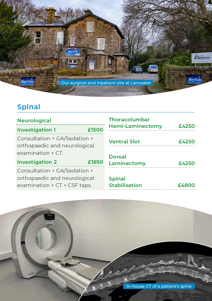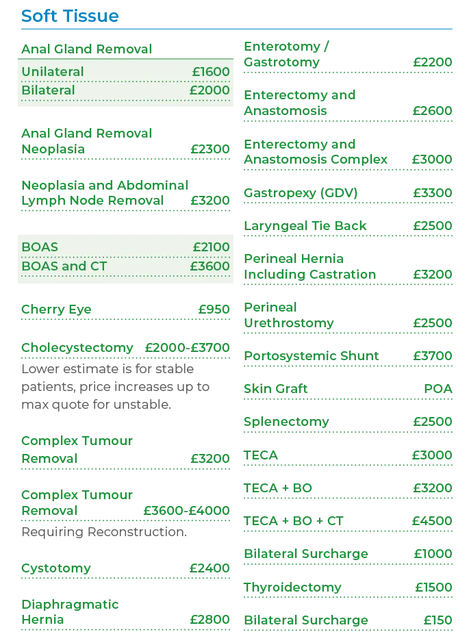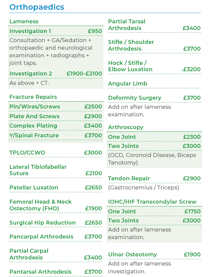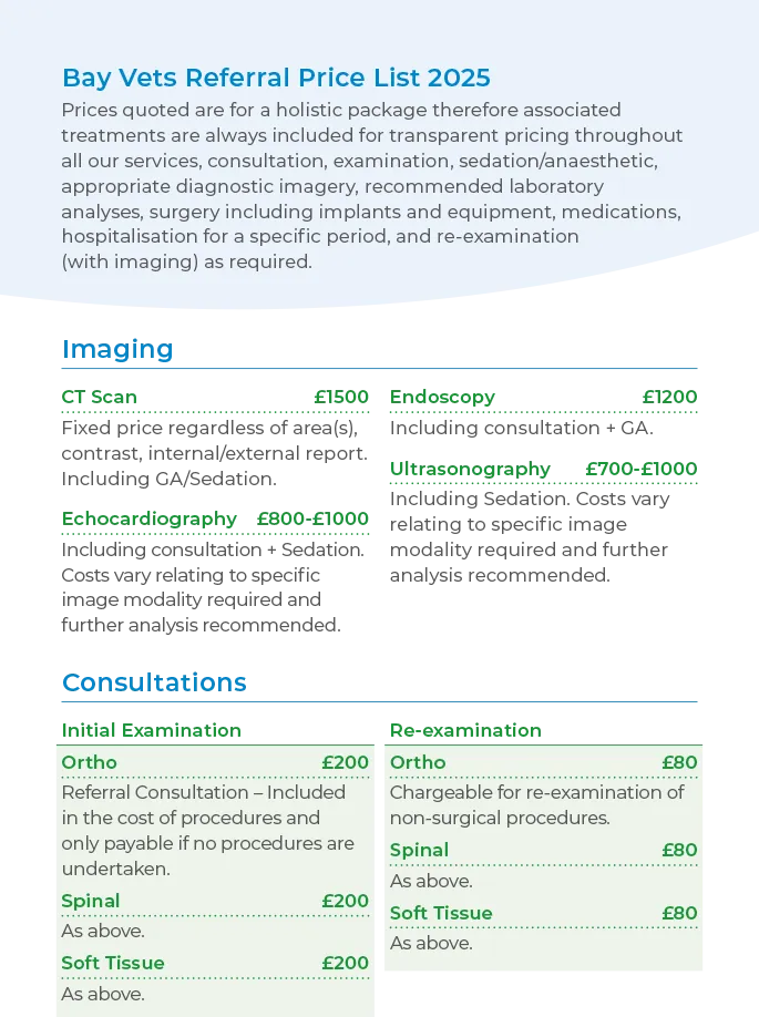 You will have been given an estimate of costs upon us arranging your pet’s referral. A full price list is also available below. WE ARE PLEASED TO CONFIRM OUR PRICES REMAIN THE SAME FOR 2025.